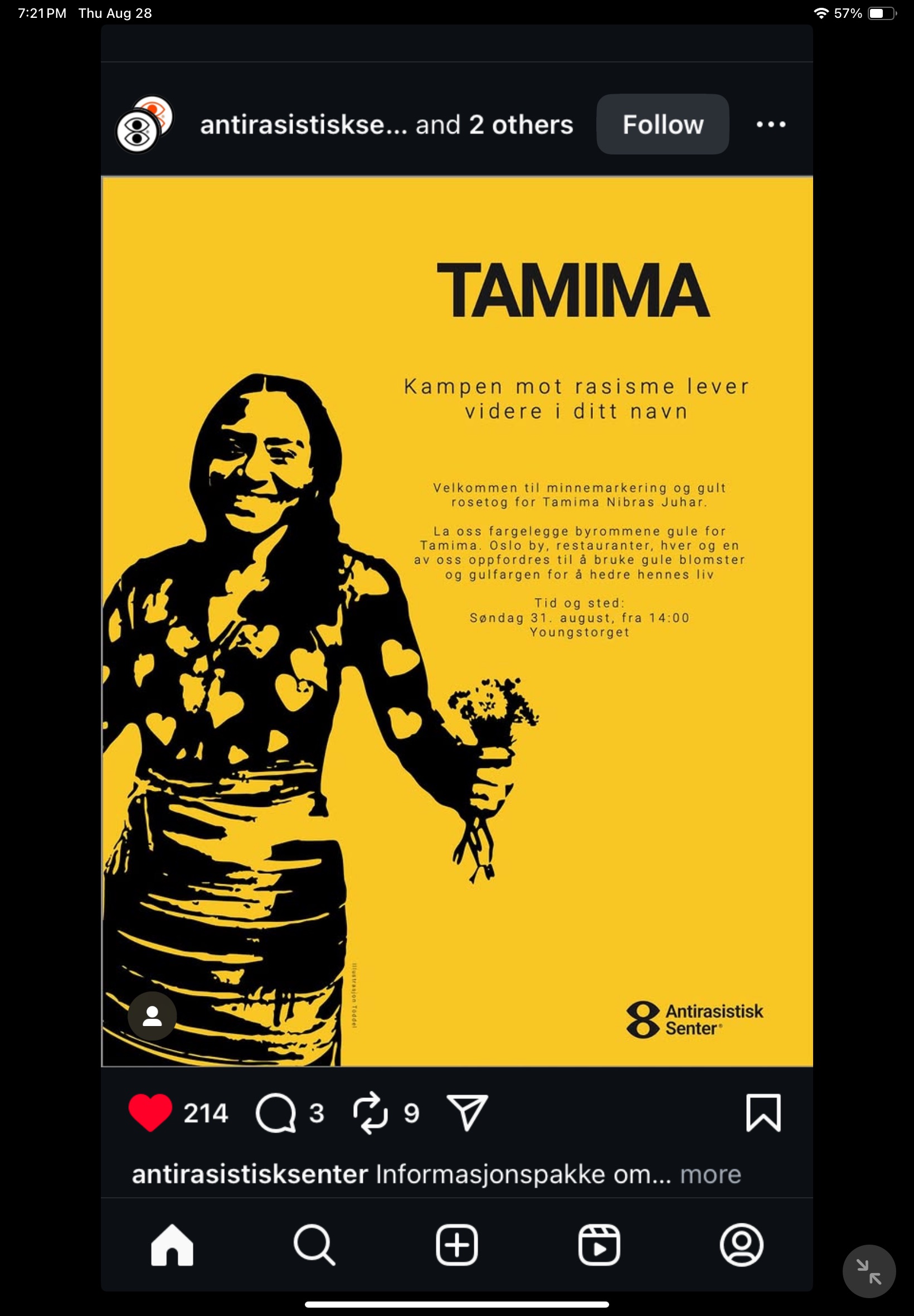- There was also a horrifying racist attack this month on a young welfare worker named Tamima Nibras Juhar, who had immigrated to Norway from Ethiopia in 2008. A large memorial was held downtown, and everyone wore her favorite color, yellow, and brought yellow flowers in tribute to her.