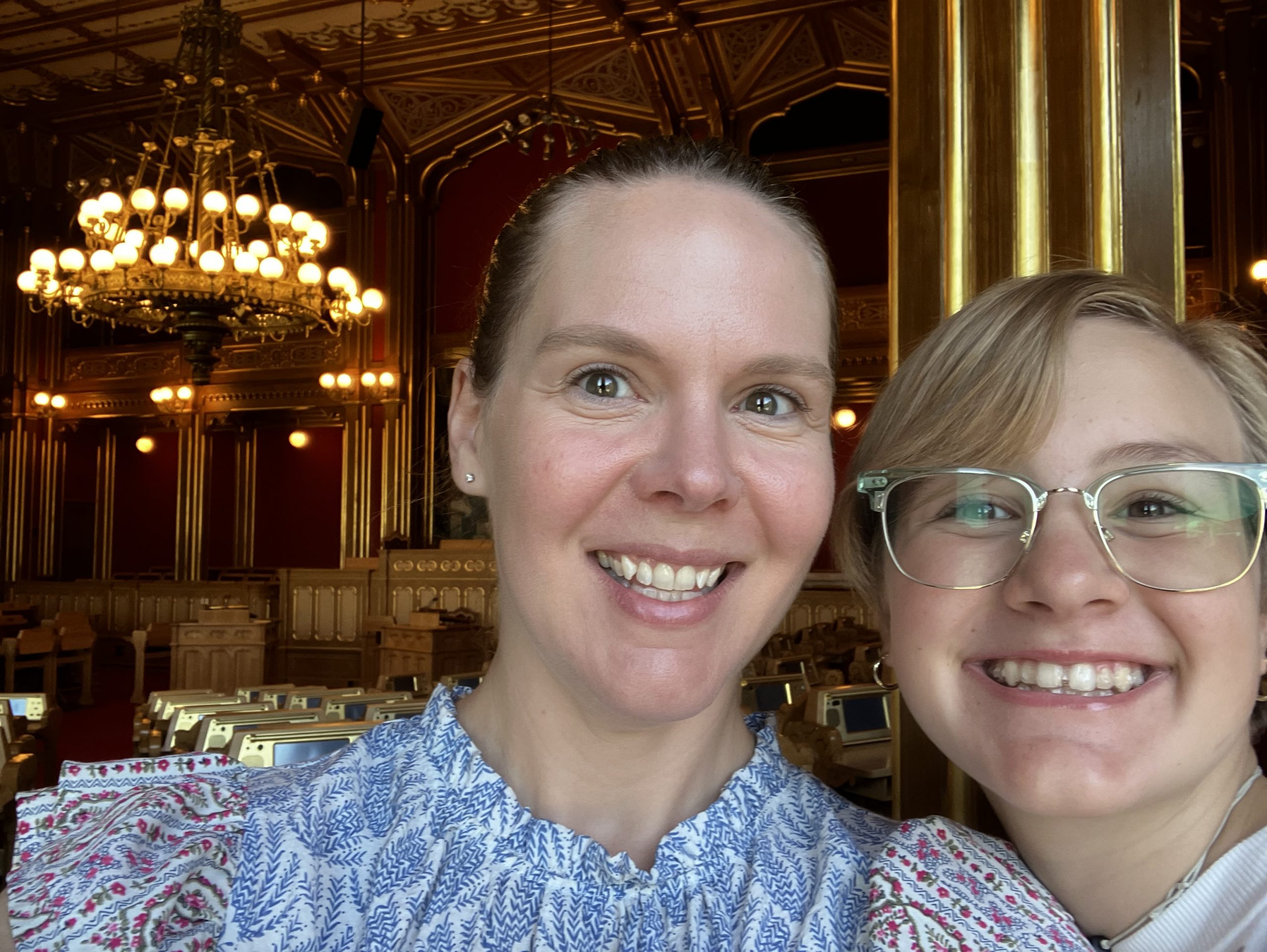 as a baby but of course doesn’t remember, and Annabel and I took a tour of Stortinget (the Norwegian parliament). One of my regular courses is an advanced Norwegian language course focused on Norwegian society and politics, so I know a fair amount about what goes on in this building, but the tour was still education, and it was exciting to see the building from the inside. (Annabel got embarrassed when the tour guide couldn’t remember a word in English, so he said it in Norwegian, and I translated it for him.)