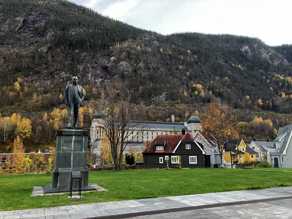 My first trip was to Rjukan to visit the Vemork power plant. Rjukan is a UNESCO world heritage site for several reasons: It was the result of a unique vision for industrial growth in the early 20th century, its workers played an important role in the organized labor movement, and under the Nazi occupation, it was the site of a famous heavy water sabotage action by Norwegian resistance fighters. The engineer Sam Eyde viewed the Rjukan falls as the potential site for a hydropower plant that could be used in the production of fertilizer by deriving nitrogen from the air. There were few people living in Rjukan in the early 1900s, so Eyde created a town for the company’s workers.