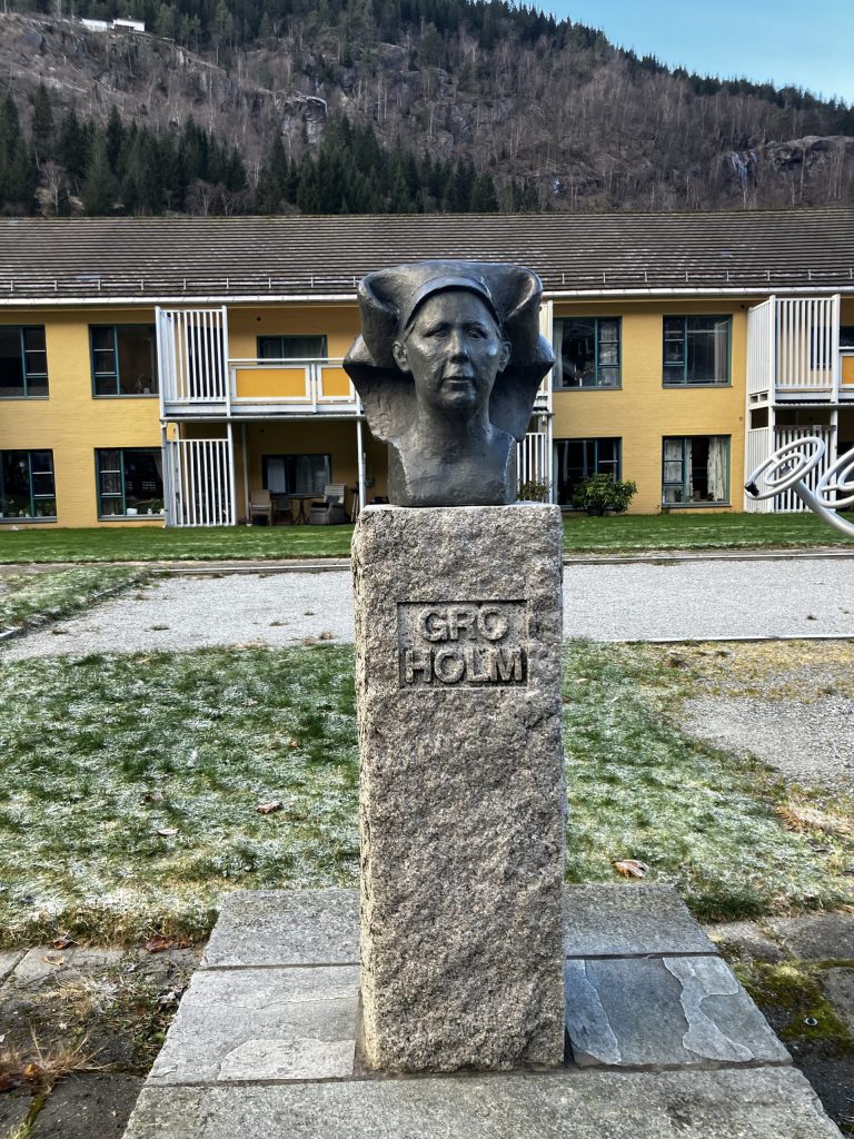 My visit to Odda was focused on the history of tourism in the area, a trade that was significantly disrupted by the arrival of factories fueled by hydropower. The industrial infrastructure clashed with German and British tourists’ desire for pristine nature and quaint, pastoral communities, and the factories emitted unsightly pollution as well. Through a connection at the university, I was able to talk to a local hotel owner who is extremely knowledgable about the area and its history and provided leads to other sources as well. In Odda, I was looking also for traces of the author Gro Holm, whose novel I write about in the same chapter. She was a fascinating figure with a keen understanding of how the social and economic changes brought about by industrialization impacted people differently depending on their occupation, gender, and even age. There is a bust of her next to the town’s youth club. The same museum staff member who told me about the ghost said Holm is sometimes called the most kissed woman in Odda because so many kids have given into the impulse to give her a smooch on their way to and from the club.