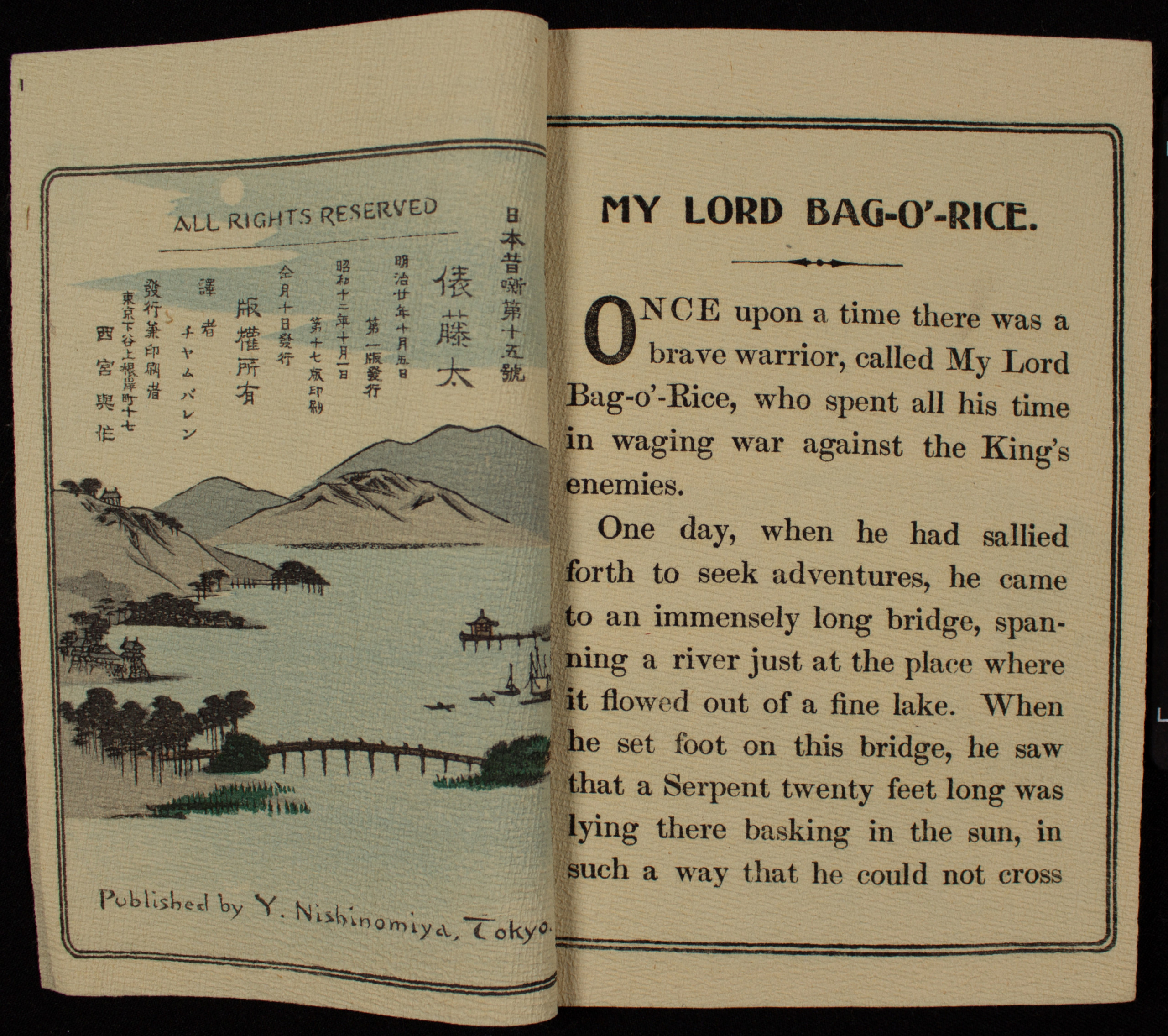 Once there was a warrior named My Lord Bag-o'-Rice, who was always seeking out adventures. He came across a very long bridge one day, and as he started to cross he saw a twenty foot long serpent blocking the path. Unafraid, he walked over the serpent. As he stepped on it, the serpent transformed into a tiny Dwarf, who immediately thanked him for being brave enough to pass by and free him from his curse. The Dwarf explained that his enemy was the Centipede atop the mountain, and asked the warrior to join him for a feast in his home beneath the lake. They rejoiced together, sharing a wonderful meal, drinking and singing, when they suddenly heard a monstrous thudding. The Centipede was approaching, and it appeared to have an army of a thousand men. The warrior saw that it was no army, just a thousand legs, covered in sticky poison. He grabbed his massive bow, and shot at its forehead. The warrior never missed, and yet the arrow did not stick. His second shot was the same, and the Centipede was almost in the water. The Warrior knew that human spittle would kill the Centipede, and spat on his final arrow, and hit and killed the Centipede at last. Suddenly, the warrior was back at his castle, surrounded by gifts from the Dwarf. He was given a large bronze bell for his religion and bravery, a sword of infinite victory, armor that no arrow could pierce, a roll of silk which never ran out, and a bag of rice. The rice never depleted, and he is named for this gift as it was both strange and wonderful, providing the warrior with the means to keep him and his family healthy.