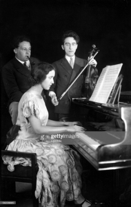 Paris, around 1925. Arthur Honegger with pipe, Jean Cocteau with violin and Andree Vaurabourg (at the piano)