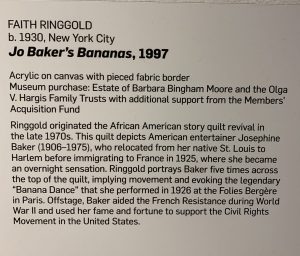 This past interim, I had the opportunity to spend the month of January in Washington D.C. with Professor Epstein while taking a course called “Democracy and the Arts in Washington DC”. Towards the beginning of the trip, we visited the National Museum for Women in the Arts. Touring around the museum we came across a mixed media work Jo Baker’s Bananas by artist Faith Ringgold. Professor Epstein pointed this piece out to me, telling me that it would be relevant to the themes and ideas we will explore in Music 345 this semester.  And, now, the time is finally here for me to dive deeper into the 1920s and the influences of jazz, Josephine Baker, and the avant-garde…