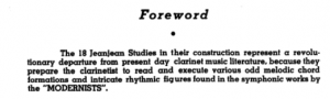 The Foreword from Paul Jeanjean’s 18 etudes, originally published in 1928. It reads: “The 18 Jeanjean Studies in their construction represent a revolutionary departure from present day clarinet music literature, because they prepare the clarinetist to read and execute various odd melodic chord formations and intricate rhythmic figures found in the symphonic works by the “MODERNISTS.” This foreword made me smile since I know have an idea who the “MODERNIST” Jeanjean refers to might be.