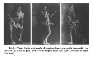 The costumes assigned to Josephine Baker were just as ridiculous and explicit as her dances, if not more so. For the banana dance, she was made to wear a costume that consisted of a nearly-absent bikini top, gigantic jewelry, golden sandals, and a golden banana skirt — quite literally made of phallic-like bananas, as photographed below: