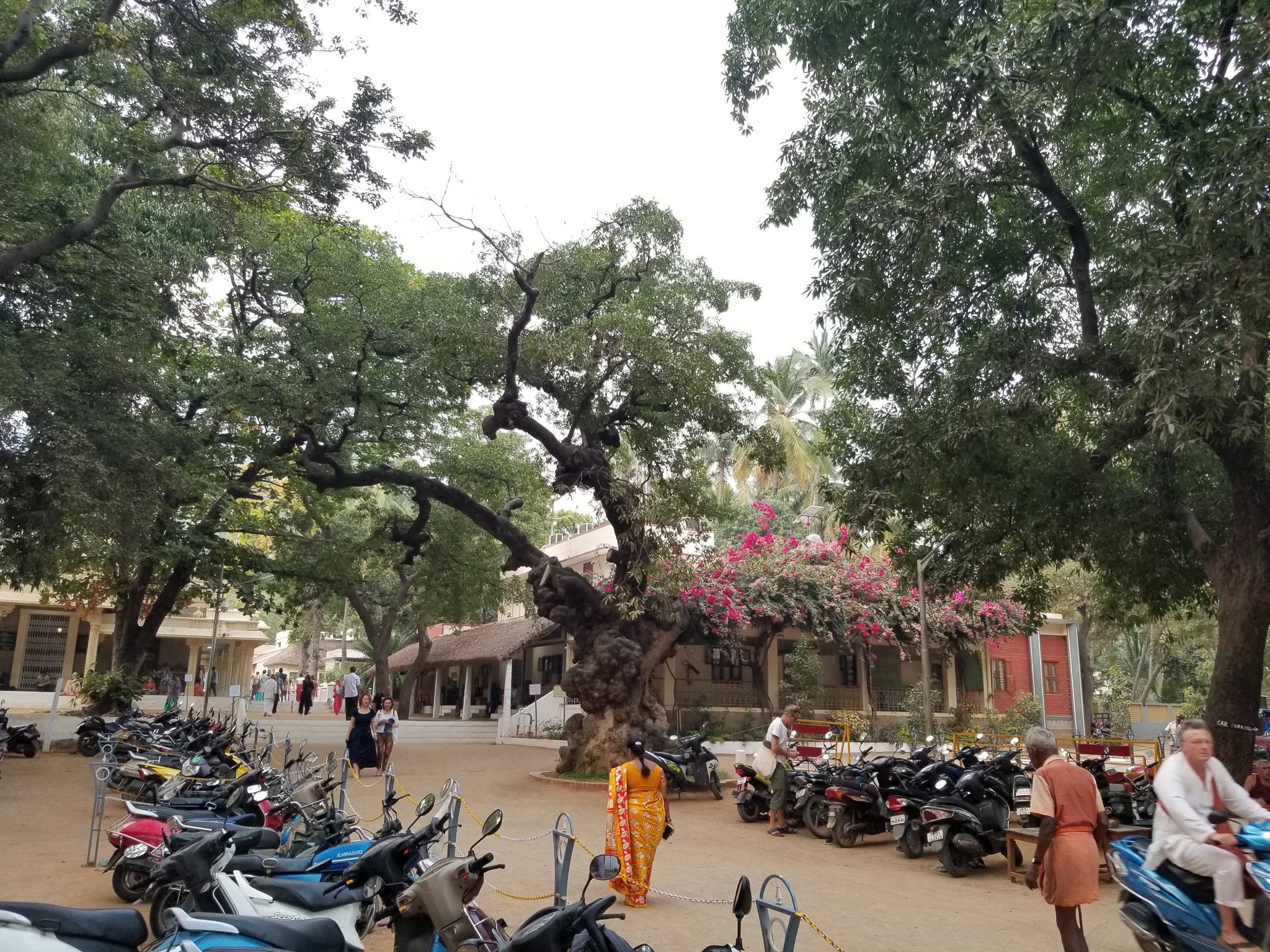 A woman chanting loudly in unison with the priests performing ritualistic mantras and nitya carried a baby squirming and crying in her arms. It seemed that this place, walls reverberating with the intensely loud crowd of people pressed should to shoulder and clanging bells, was a less-than-ideal place for a young child. But more shocking than the child was the obvious fact that she was not Indian, but a light-skinned woman from the West. A quick scan around revealed that the entire Ashram enclosed more Westerners than Indians.This makes sense because the Sri Raman Ashram is a popular tourist location for seekers from all over the globe to come and experience spirituality. Our host at Quo Vadis informed us that the site welcomes people, religious and not, to open their minds and souls in the environment–the Ashram’s website, too, boasts visitors “do not need to adopt any belief system, or worship anyone…to experience this transmission of bliss and clarity.” The Ashram houses the remains and teachings of Ramana Maharshi, a 20th century Indian sage who experienced an ego death and spiritual awakening at a very young age. His message focuses on encouraging people to look inward at the self to realize that real happiness comes from within, not from the material and continually changing world. We experienced an interesting dichotomy at the Ashram: after weeks of being in India as strange Americans continuously approached for selfies, it still felt odd even when surrounded by people that looked like us at the Ashram; it felt as though the authenticity and sacredness of the site was compromised because of our and the rest of the Westerners’ presence.