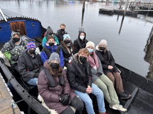 On Tuesday, we resumed a somewhat normal schedule with a class session in the morning. Half the students attended in the conference room with the other half on Zoom. In the afternoon, we took a tour on traditional Norwegian boats through the Nidelva River. Despite the sleety snowfall and necessary masking, this was a beautiful way to experience the city!